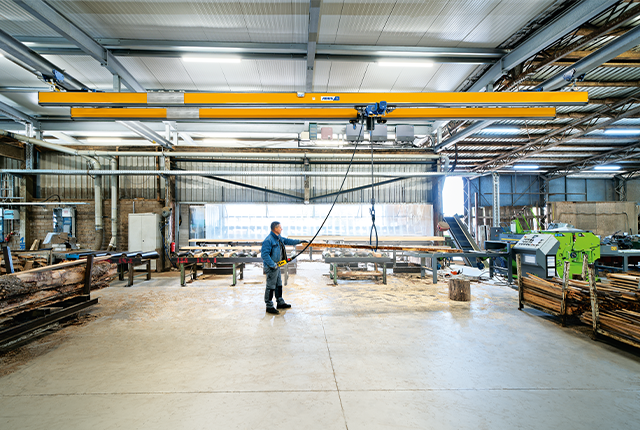 De monorailbaan ESB van ABUS is gespecialiseerd in het ter plaatse hijsen en het lineaire transport van het ene naar het andere punt. Door de uitbreiding met bochtstukken beweegt het hijswerktuig naar wens door de hele hal. Zo kunnen werkplekken met elkaar worden verbonden of kunnen machines worden verplaatst.