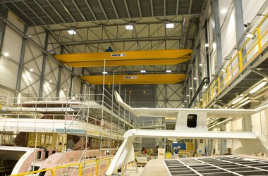 Het bedrijfsmotto van Heesen was veeleisend en tegelijk stimulerend voor de Nederlandse vestiging ABUS Kraansystemen B.V. (www.abus-kraansystemen.nl) in IJsselstein. De hallen waar jachten worden samengebouwd en uitgerust worden met verschillende componenten, dienden te worden ingericht met ABUS kranen. Een gedeelte van de transportopdracht was het realiseren van een grote hijshoogte op grond van de forse bouwhoogte van de jachten. Zo werd in elk van de 3 hallen een dubbelliggerkraan ZLK met een hijscapaciteit van 16 ton alsmede en dubbelliggerkraan ZLK 2 x 8T (uitvoering met ABUS staaldraadtakels) en een overspanning van 24 meter, geïnstalleerd. Deze kranen onderscheiden zich door een zeer grote hijshoogte (30 meter). In een andere Hal wordt een ABUS kraan type enkelligger ELV met een hijscapaciteit van 1,6T en een overspanning van 14 meter ingezet.