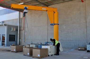 Phase 1 consists of one VS type ABUS Pillar mounted Jib crane SWL 2 ton, 5 m reach with a 4.4 m height of lift situated outside the warehouse for loading purposes for lifting of heavy machine parts. Inside the warehouse, an ABUS ZLK Double Girder Crane, SWL 25 tons, 13.3 m span, 7.57 m height of lift was erected and commissioned for use in loading medium weight Caterpillar equipment. An ABUS Single Girder EDL Underslung Crane, SWL 2.5 tons, 16.5 m span, 8.44 m height of lift was erected and designed for use in the forklift battery bay / heavy quality bay area.