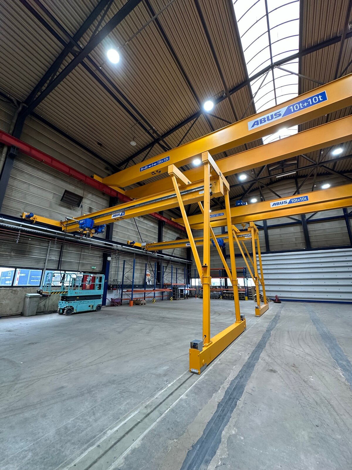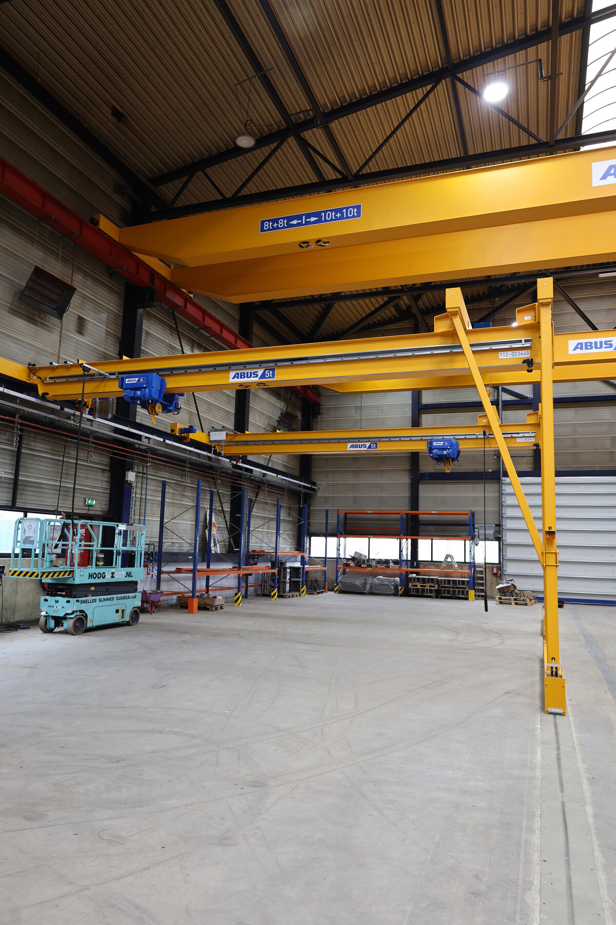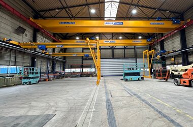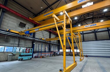 - Drie enkelligger-halfportaalkranen met een hijsvermogen van elk 5 ton. Deze kranen zijn ideaal voor het efficiënt verplaatsen van werkstukken binnen een deel van de hal en zorgen voor een flexibele werkindeling zonder in te boeten op hefvermogen.