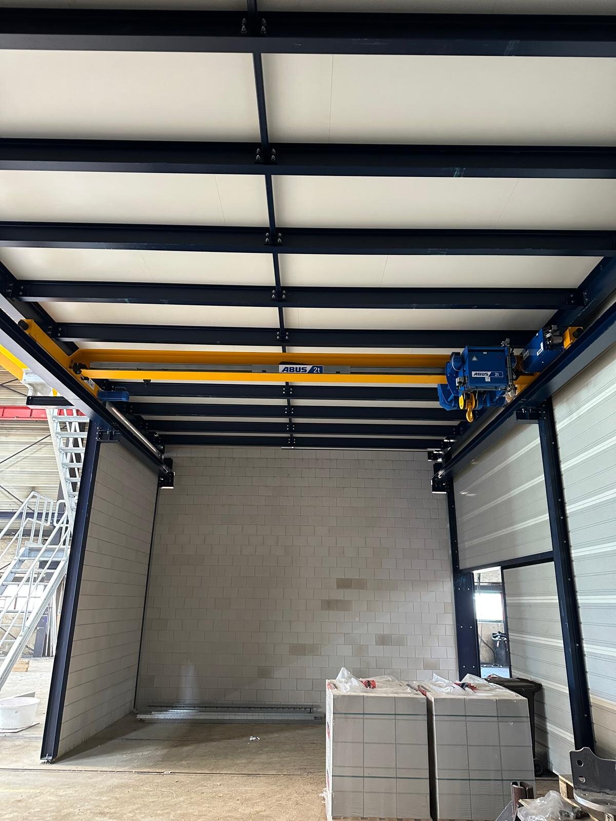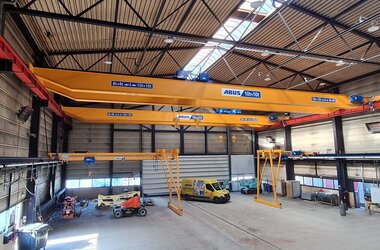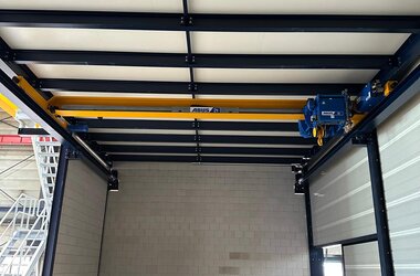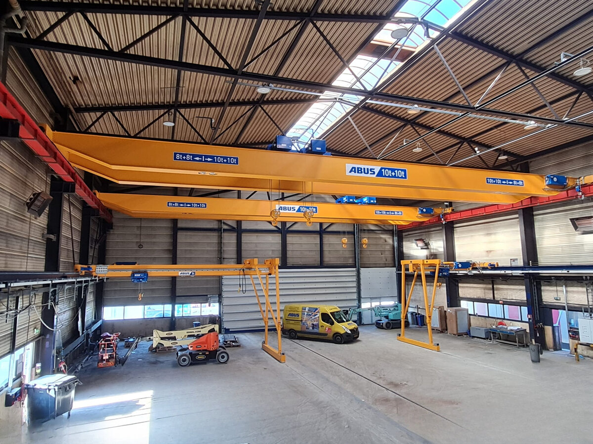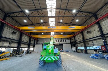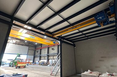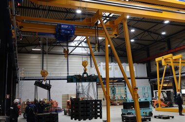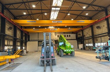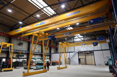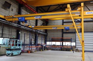 - Drie enkelligger-halfportaalkranen met een hijsvermogen van elk 5 ton. Deze kranen zijn ideaal voor het efficiënt verplaatsen van werkstukken binnen een deel van de hal en zorgen voor een flexibele werkindeling zonder in te boeten op hefvermogen.