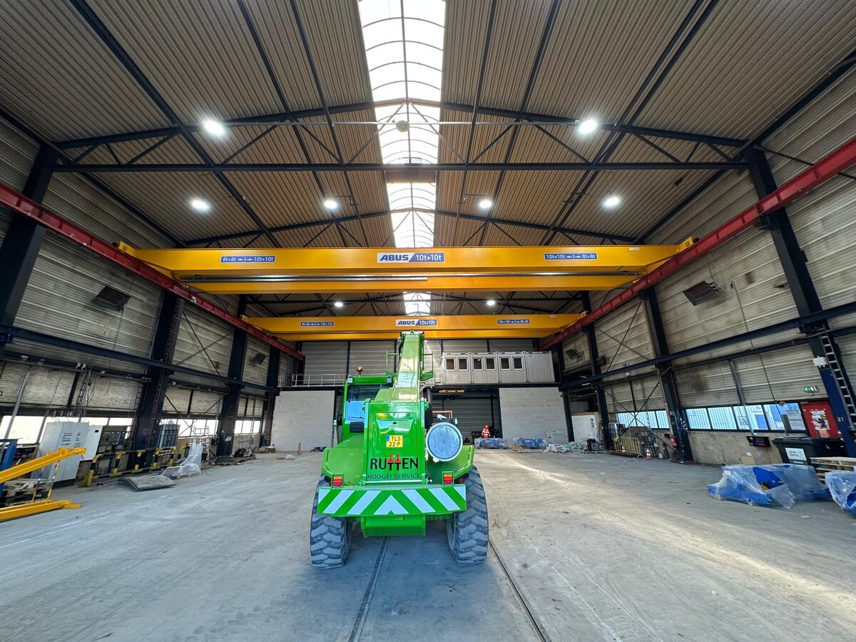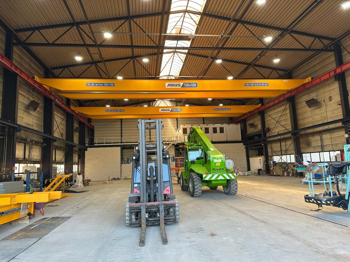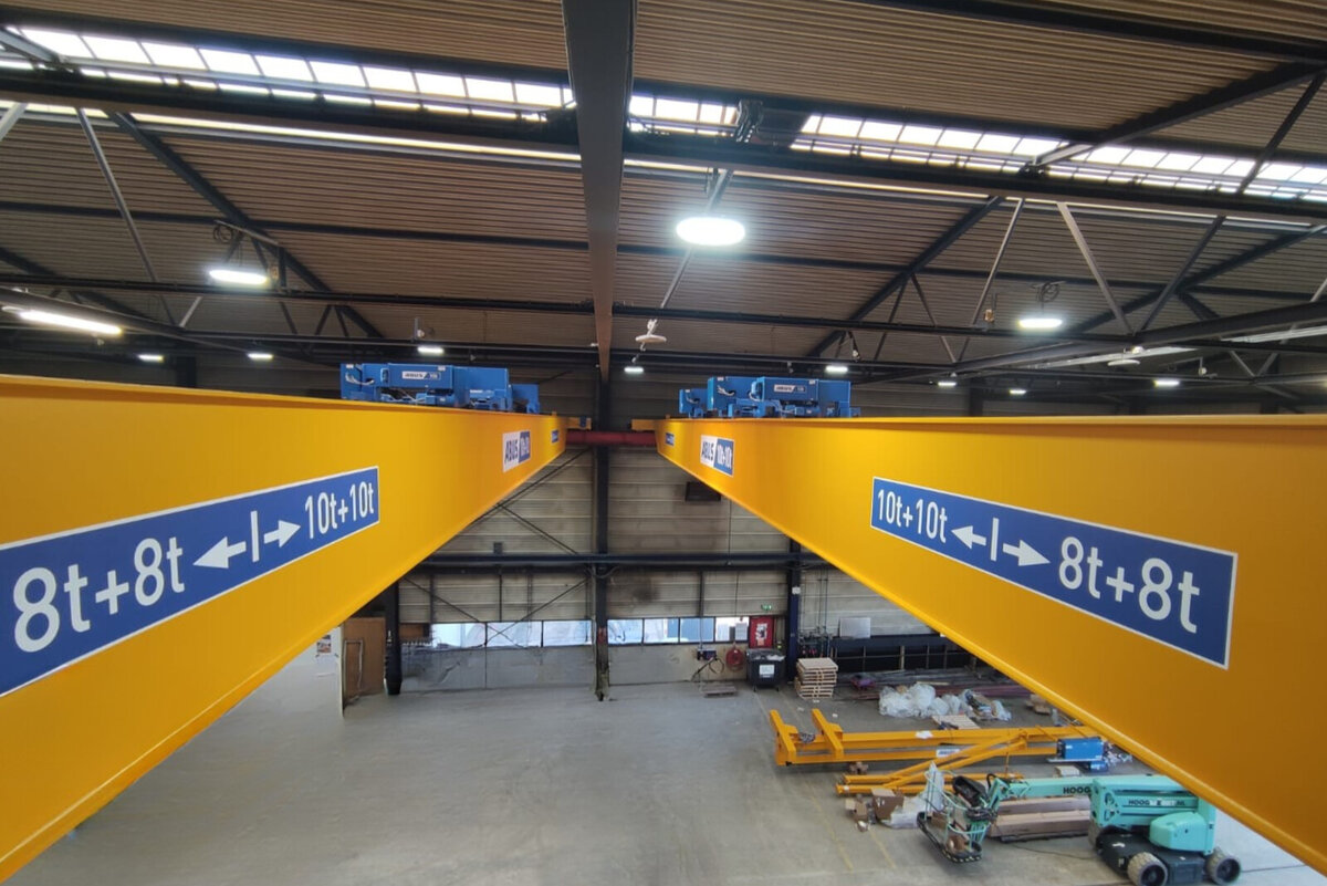 - Twee dubbelligger bovenloopkranen met dubbele elektrostaaldraadtakels. Deze kranen kunnen elk 10 ton per takel hijsen wanneer de last in het midden van de kraan hangt. Vanwege de structuur van de hal is de maximale capaciteit buiten de gemarkeerde zones beperkt tot 8 ton per takel. Deze opstelling maakt het mogelijk om zowel lange als zware onderdelen veilig te hanteren, met behoud van flexibiliteit in de werkruimte.