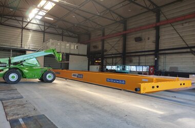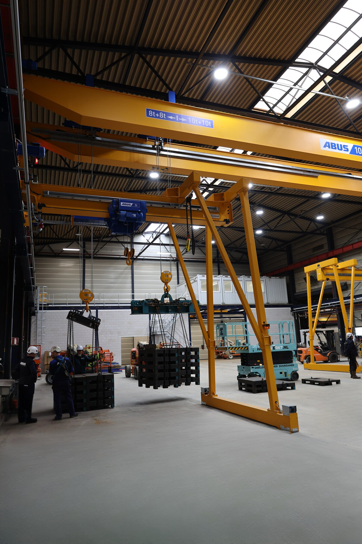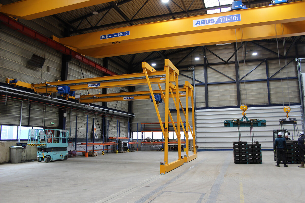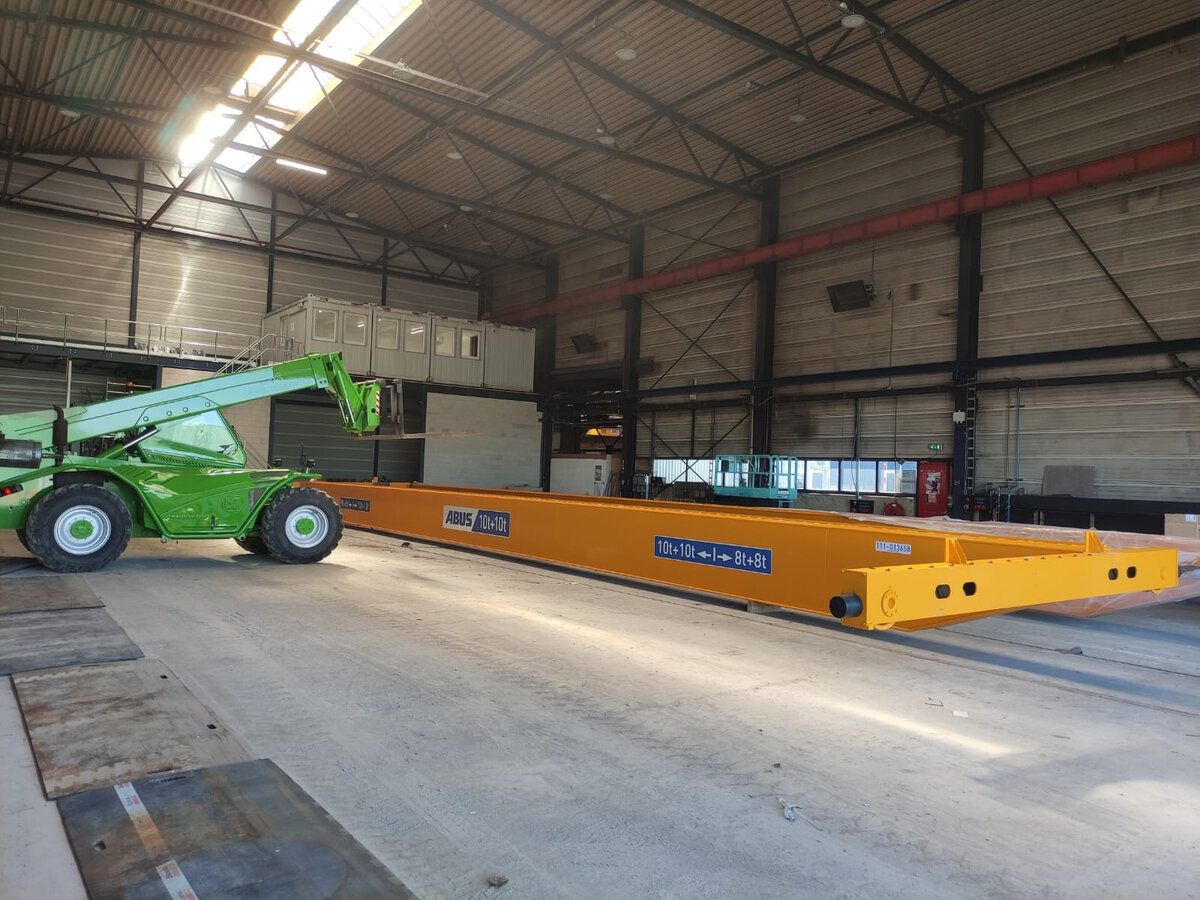 - Twee dubbelligger bovenloopkranen met dubbele elektrostaaldraadtakels. Deze kranen kunnen elk 10 ton per takel hijsen wanneer de last in het midden van de kraan hangt. Vanwege de structuur van de hal is de maximale capaciteit buiten de gemarkeerde zones beperkt tot 8 ton per takel. Deze opstelling maakt het mogelijk om zowel lange als zware onderdelen veilig te hanteren, met behoud van flexibiliteit in de werkruimte.
