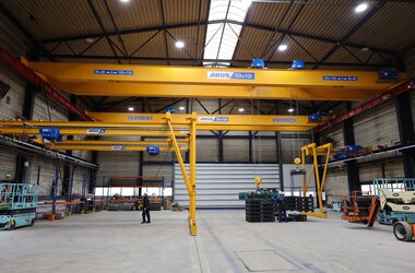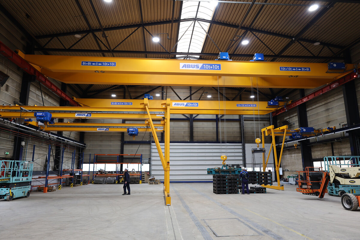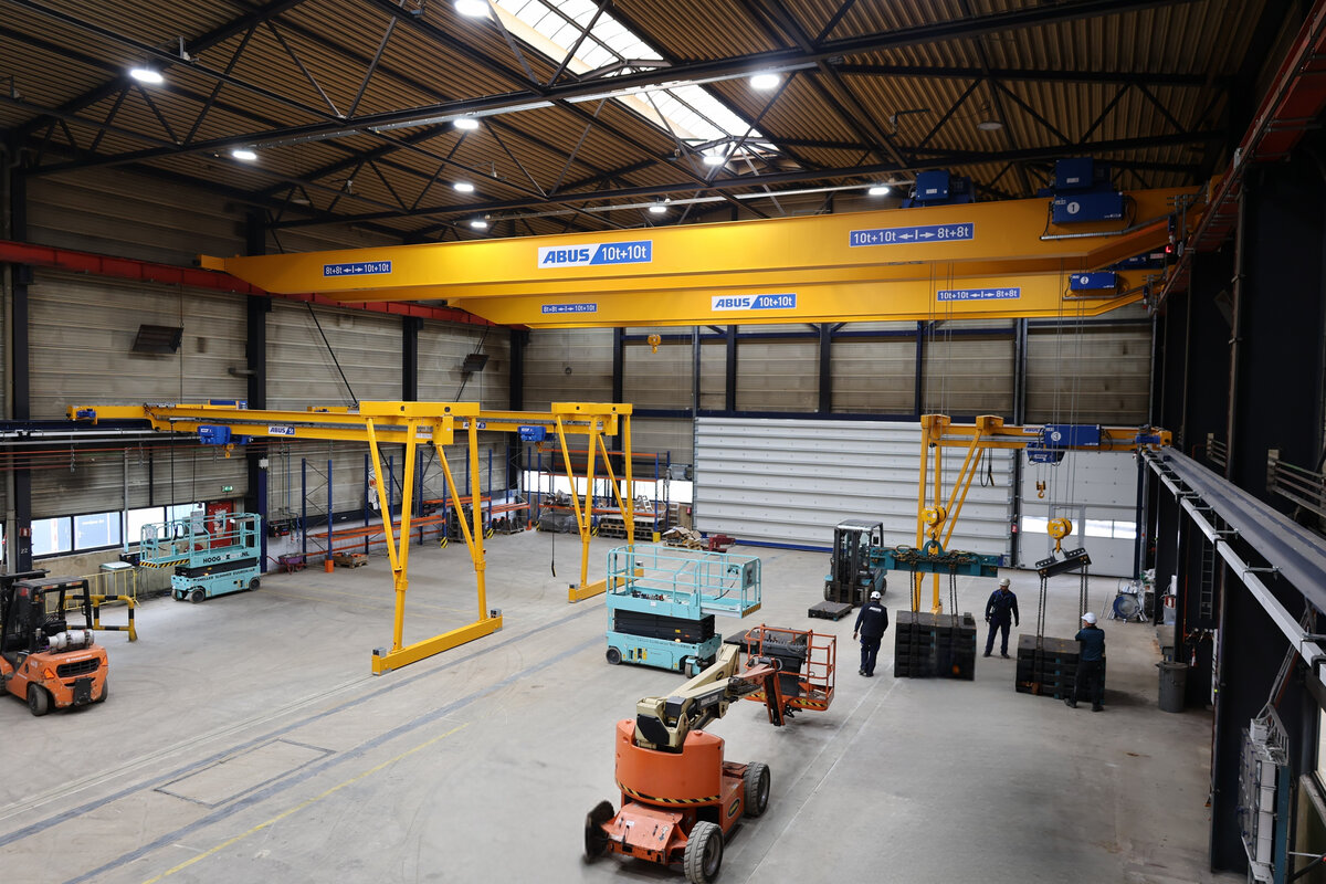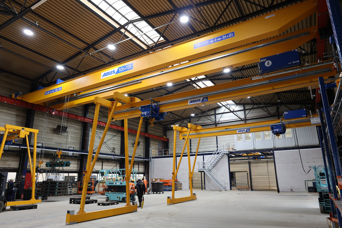 Bij Hollandia in Krimpen aan den IJssel – specialist in het ontwerpen en bouwen van complexe staalconstructies – levert ABUS Kraansystemen een belangrijke bijdrage aan de dagelijkse werkzaamheden in de productielocatie. In een van de ruime hallen van het bedrijf zijn verschillende kraansystemen geïnstalleerd om het zware staalwerk veilig, nauwkeurig en efficiënt te kunnen verplaatsen.